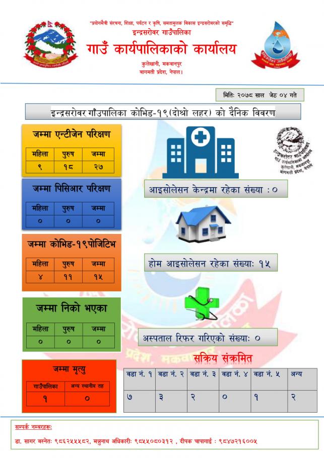 इन्द्रसरोवर गाँउपालिका कोभिड-१९(दोश्रो लहर) को दैनिक विवरण (मिति २०७८-०२-०४)