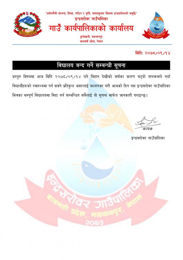 » इन्द्रसरोवर गाउँपालिका भित्रका सम्पूर्ण विद्यालयहरू बन्द गर्ने सम्बन्धी सूचना!!