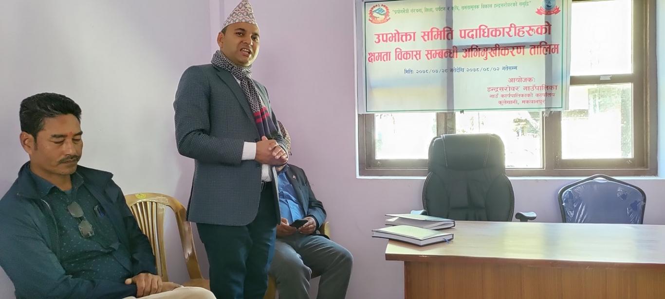 आज मिति २०७८-०७-२९ गते इन्द्रसरोवर गाउँपालिकाको आयोजनामा उपभोक्ता समिति पदाधिकारीहरूको क्षमता विकास सम्बन्धी अभिमुखीकरण तालिम २ नं. वडा ,कुलेखानीमा सम्पन्न भयो। उक्त कार्यक्रमको अध्यक्षता २.नं. वडा अध्यक्ष श्री राजुमान महर्जन ज्यूले गर्नु भएको थियो भने इन्द्रसरोवर गाउँपालिकाका अध्यक्ष श्री जीवन लामाज्यू प्रमुख अतिथि, प्रमुख प्रशासकीय अधिकृत श्री बलराम लम्सालज्यू का साथै अन्य विशिष्ट व्यक्तिहरुको समुपस्थिति रहेको थियो। साथै उक्त कार्यक्रममा गाउँपालिका इन्जिनियर श्री विमल मिक्तान, योजना शाखाबाट श्री गंगा राई, श्री हिरालाल बलामीले सहजीकरण गर्नु भएको थियो।