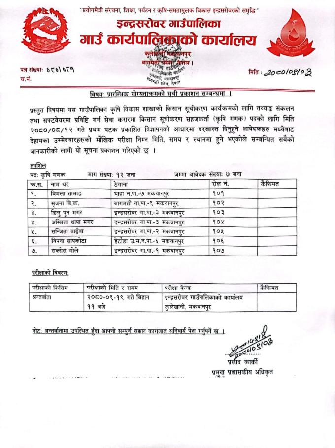 किसान सुचीकरण सहजकर्ता (कृषि गणक) पदको प्रारम्भिक योग्यताक्रमको सुची प्रकाशन गरिएको सम्बन्धमा ।