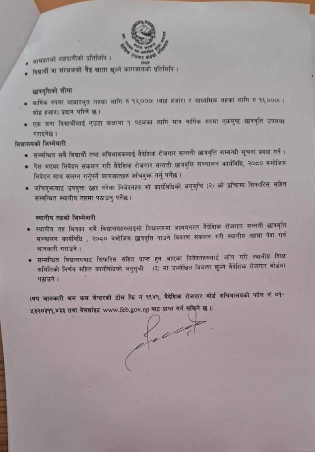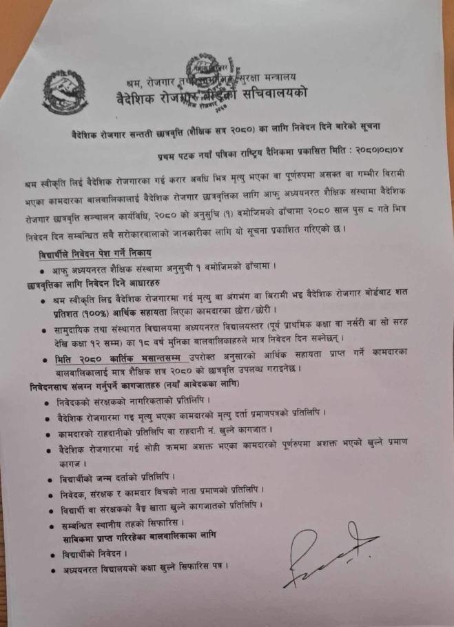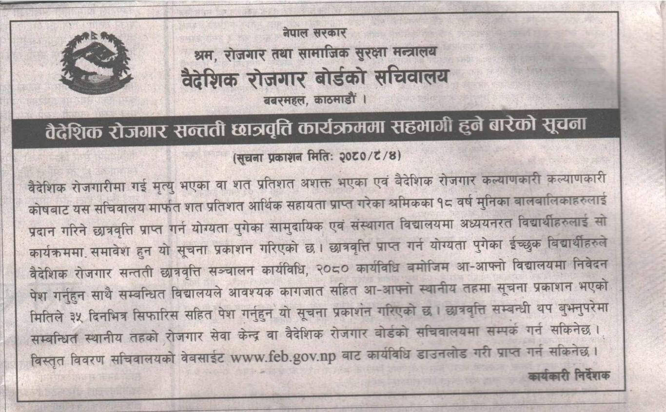 वैदेशिक रोजगार सन्तती छात्रवृति सम्बन्धी सूचना |