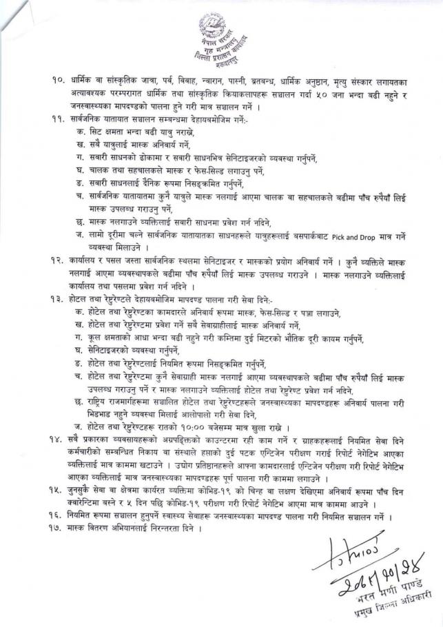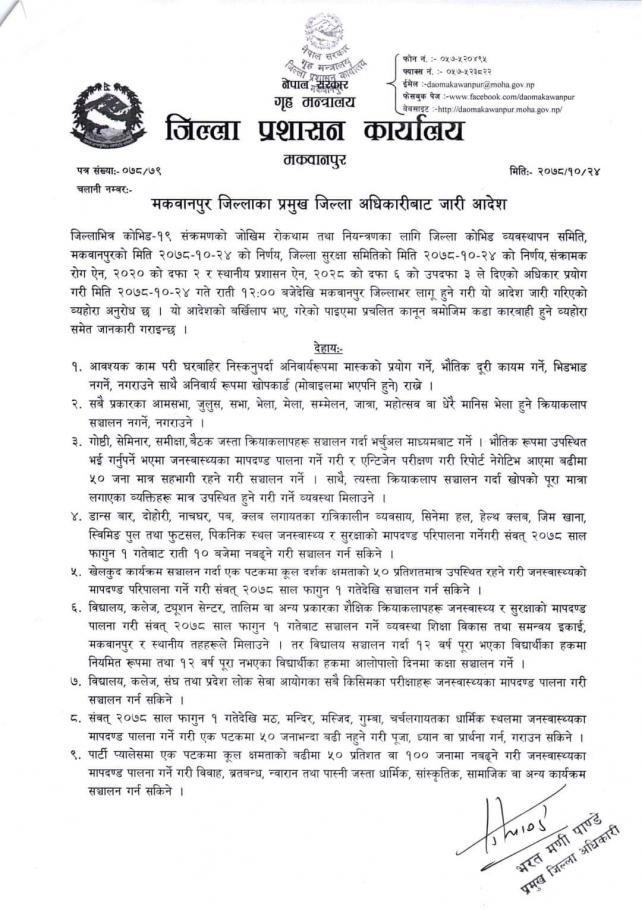 » मकवानपुर जिल्लाका प्रमुख जिल्ला अधिकारीबाट जारी आदेश (२०७८-१०-२४) ।
