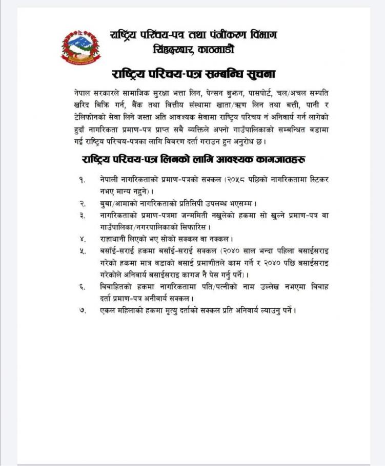 राष्ट्रिय परिचय-पत्र सम्बन्धी सूचना ।