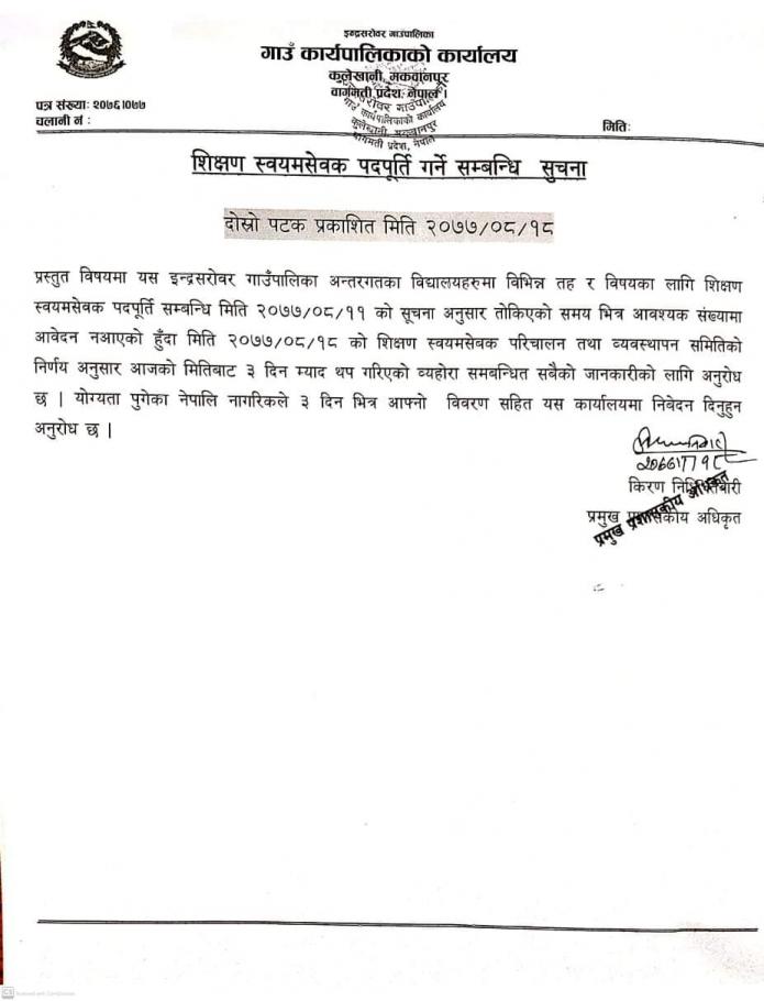 शिक्षक पदपूर्ति गर्ने सम्बन्धी सूचना ।