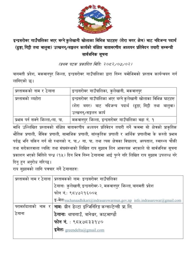 कुलेखानी खोलाका विभिन्न घाटहरुबाट नदिजन्य पदार्थ उत्खनन् संकलन कार्यको प्रारम्भिक वातावरण अध्ययन प्रतिवेदन तयारी सम्बन्धी सार्वजनिक सूचना |