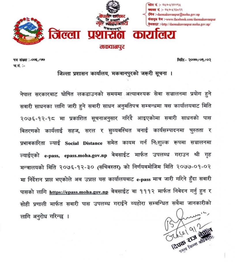 अत्यावश्यक सवारी पासका लागि जिल्ला प्रशासन कार्यालय मकवानपुरको सुचना!