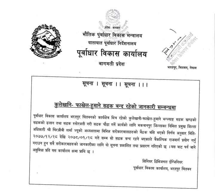 » कुलेखानी-फाखेल-हुमाने सडक बन्द रहेको जानकारी सम्बन्धी सूचना ।