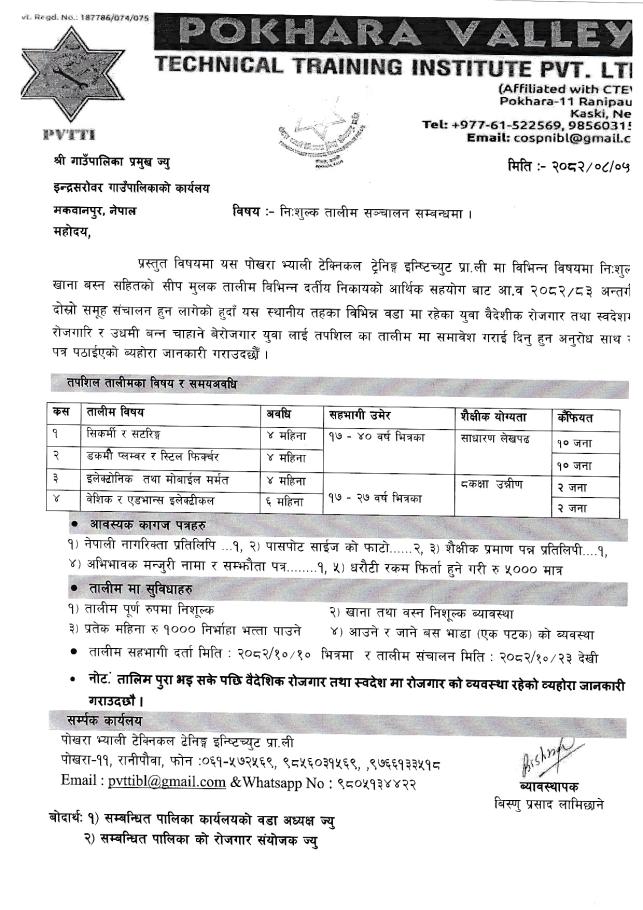 नि:शुल्क तालिम सम्बन्धी सूचना ।