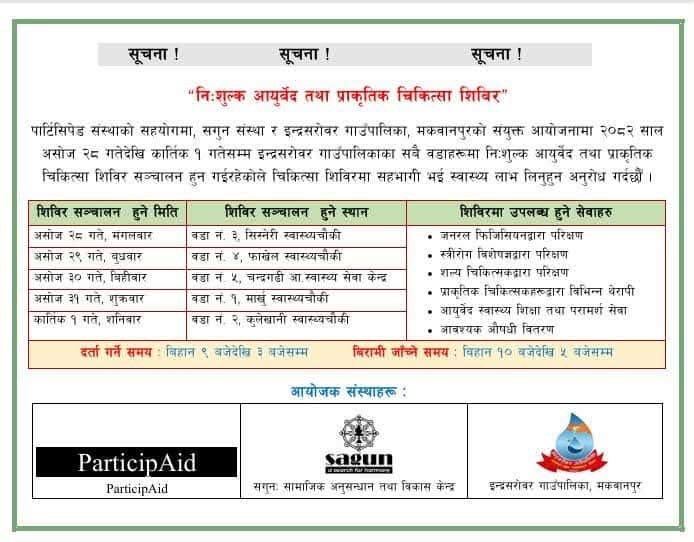 नि: शुल्क आयुर्वेद तथा प्राकृतिक चिकित्सा शिविर हुने सम्बन्धी सूचना |