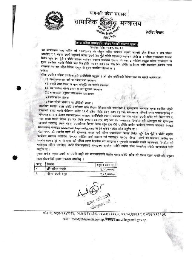 महिला उद्यमीहरूले निवेदन पेश गर्ने सम्बन्धी सूचना ।